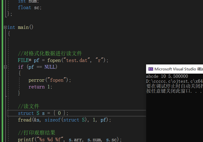 int main() { FILE*pf = fopen("test.dat","r"); if(pf == NULL) { perror("fopen"); return 1; } struct S s = {0}; fread(&s,sizeof(struct S),1,pf);