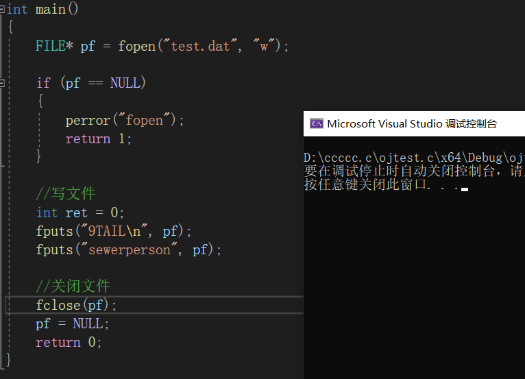 int main() { FILE*pf = fopen("test.dat","w"); if(pf == NULL) { perror("fopen"); return 1; } struct S s = { "abcde",10,5.5f }; fwrite(&s,sizeof(struct S),1,pf);
