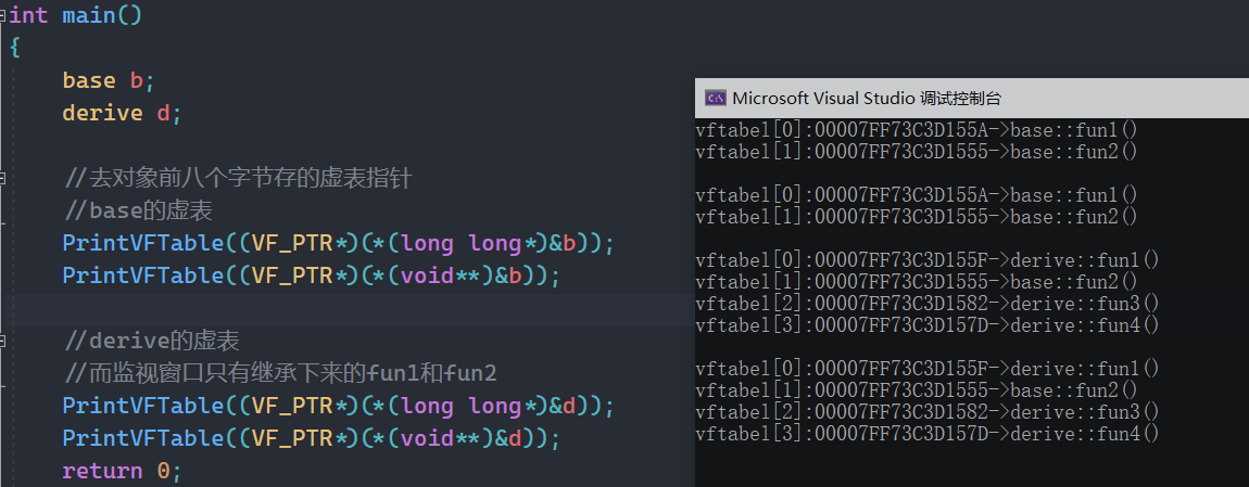 1 2 3 4 5 6 7 8 9 10 11 12 13 14 15 16 17 18 19 20 21 22 23 24 25 26 27 28 29 30 31 32 33 34 35 36 37 38 39 40 41 42 43 44 45 46 47 48 49 50 51 52 53 54 55 56 57 58 class base { public : virtual void fun1 () { cout << "base::fun1()" << endl; } virtual void fun2 () { cout << "base::fun2()" << endl; } virtual void fun3 () { cout << "base::fun3()" << endl; } private : int _b = 1 ; }; class derive : public base{ public : virtual void fun1 () { cout << "derive::fun1()" << endl; } private : int _d = 2 ; }; void test () { base b1; printf ("_vftptr:%p\n" , *(double *)&b1); printf ("_vftptr:%p\n" , *(long long *)&b1); int i = 0 ; int * p1 = &i; int * p2 = new int ; const char * p3 = "hello" ; printf ("栈变量:%p\n" , p1); printf ("堆变量:%p\n" , p2); printf ("代码段常量:%p\n" , p3); printf ("代码段函数地址:%p\n" , &base::fun3); printf ("代码段函数地址:%p\n" , test); } int main () { base b1; derive d1; test (); return 0 ; }